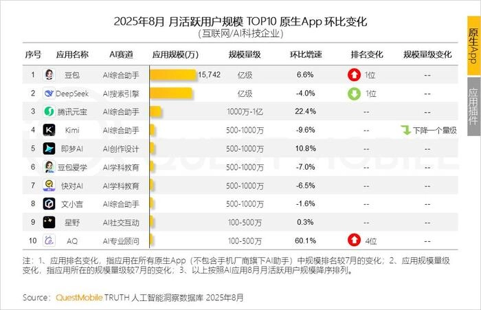 近日,QuestMobile最新发布8月榜单显示,豆包月活跃用户规模超越DeepSeek,成为中国AI APP月活用户第一,在DeepSeek长期霸榜的情况下,豆包的崛起,说明在竞争激烈的赛道,没有永远的领跑者,这对我国AI领域的发展有着极大的推动作用。