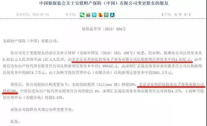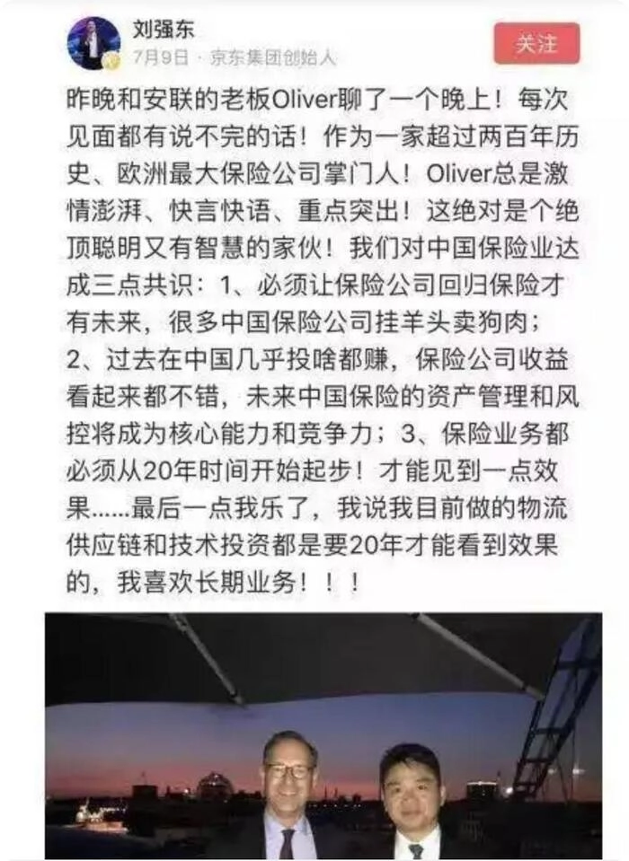 当时刘强东斥资4.83亿元,换回30%的股权。安联财险中国注册资本从8.05亿元增至16.1亿元,从外商独资变成中外合资。当时刘强东拿下安联财险兴奋之下还发了微博。京东金融CEO陈生强曾在中国保险行业协会内部的一次演讲中说:“保险加上数据、科技以及新的风险定价技术,这才是保险业接下来重回快速增长通道的核心。”而京东现在有流量有数据,这或是刘强东认为是时候在保险业有番作为了。