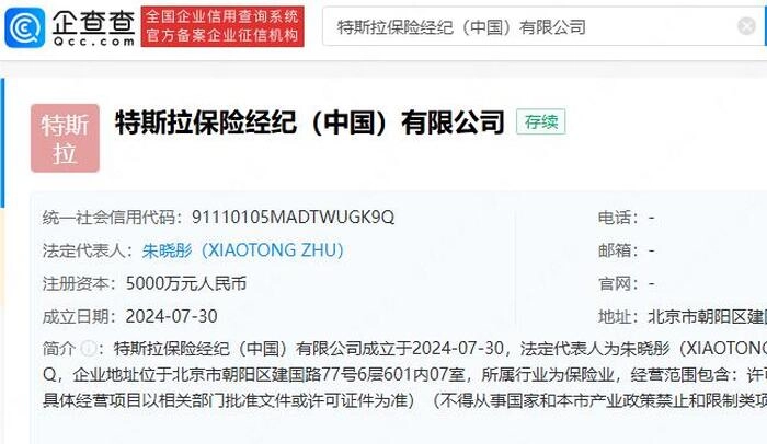 今年7月,国家市场监督管理总局公布的企业名称申报登记公告显示,特斯拉保险经纪(中国)出现在列表里。与首次申请设立保险经纪公司相比,新设立的企业类型由之前的港澳台法人独资变更为外国法人独资,且其名称中加入(中国)。