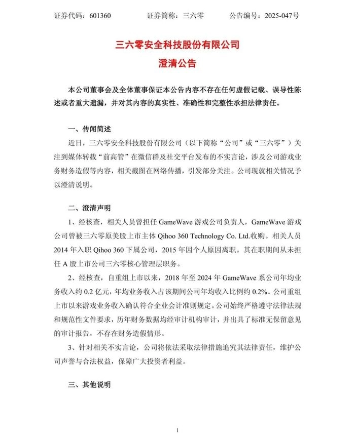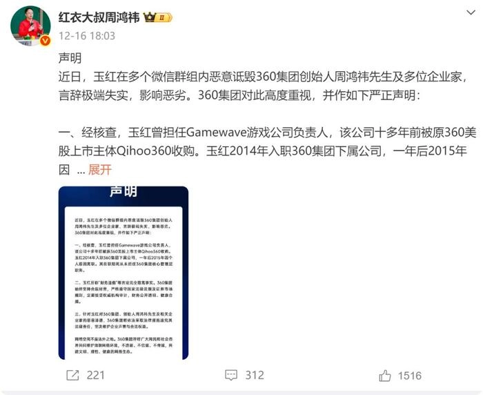 次日,三六零(以下称360)公司紧急发布公告回应称,玉红曾担任GameWave游戏公司负责人,于2014年入职360下属公司,2015年因个人原因离职,在职期间从未担任A股上市公司三六零核心管理层职务。2018年至2024年GameWave系公司年均业务收入约0.2亿元,年均业务收入占该期间公司年均收入比例约0.2%。公司重组上市以来游戏业务收入确认符合企业会计准则规定。针对相关不实言论,公司将依法采取法律措施追究其法律责任。