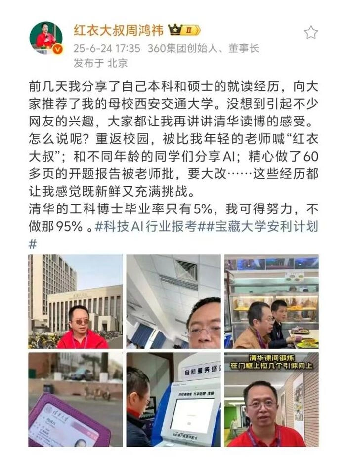 周鸿祎经常身着红色服饰、录制视频内容、开展科普工作,甚至以近似初入校园大学生的姿态,分享自身在清华大学攻读博士学位的日常生活点滴。在外界观察视角下,这位360公司的核心高层,似乎逐渐沉浸于“网红”身份所带来的乐趣,逐步转型成为一位形象亲和的科技领域博主。