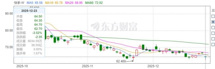 快手遇袭后的第二天,快手股价直接下跌3.52%。在2025年年内快手股价表现不俗,由年初开盘的40.74港元一路涨至10月初的92.6港元,截至12月23日收盘,快手股价为64.35港元,年内涨幅达58%。不过相比2021年417.34港元的股价高点,如今的股价跌幅已达85%。整体市值消失了15246亿港元。