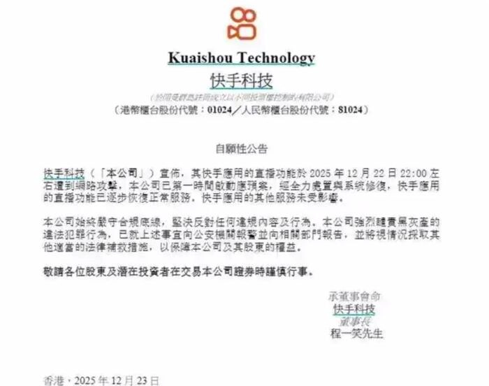 12月23日,快手发布公告回应称,其直播功能在22日晚上22时左右遭遇网络攻击,快手已经第一时间启动紧急预案,经全力处置与系统修复,直播功能已经逐步恢复正常。