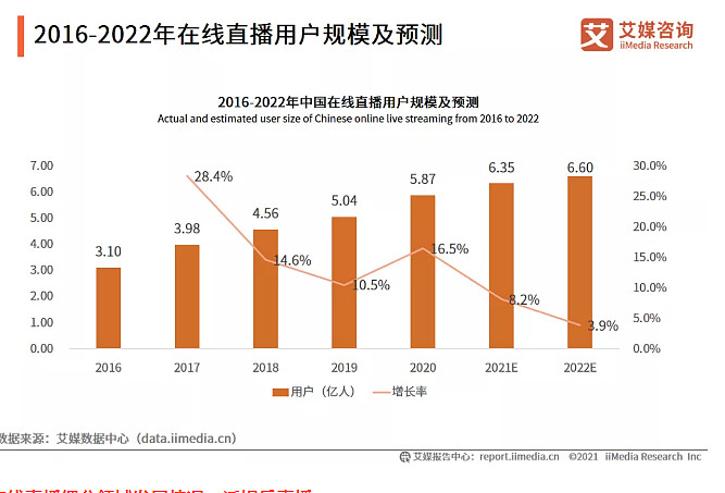 近日,艾媒咨询发布了《2021Q3中国在线直播行业研究报告》,数据显示,预计2022年在线直播用户规模将达到6.6亿人。从用户规模来看,艾媒咨询数据显示,中国在线直播用户规模保持连续增长态势,2021年中国在线直播用户规模将达到6.35亿人,预计2022年在线直播用户规模将达到6.6亿人。