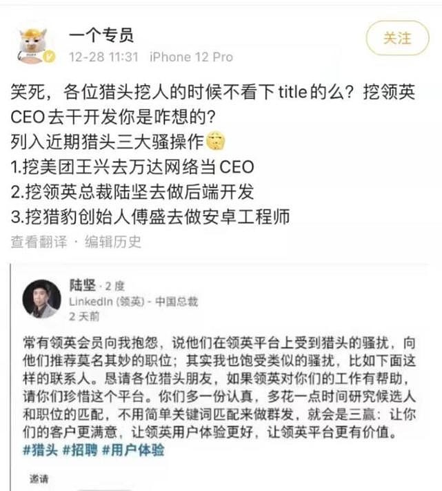 有网友在微博发文曝出,全球最大的招聘社交平台领英 $领英(LNKD)$ 的猎头竟然要挖自家老总去干后端开发。领英的猎头"嚣张"还不止于此,根据网友曝料,领英猎头还准备挖美团的王兴去万达网络当CEO;挖猎豹创始人傅盛去做安卓工程师。