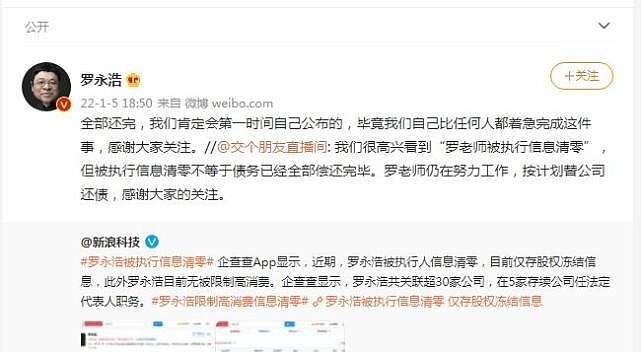1月5日,罗永浩被执行信息清零的消息上了微博热搜,罗永浩是否已经把所欠债务彻底还清成了大家关注的焦点,但从罗永浩本人的回应来看,被执行信息清零并不等于债务清零,罗永浩的债务清零还需要一定的时日。