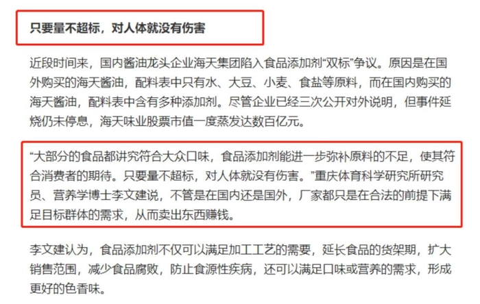 有位自称是营养学博士的博主却从反面解读了食品添加剂,他认为,食品添加剂是为了能让老百姓以极低的价格享受到美食,“一旦国家严格执行0添加,那必然会造成物价的飞涨,以海天酱油为例,0添加的不是没有售卖,但价格会让普通老百姓望而却步,0添加的酱油不仅成本高昂,保质期也很短,企业不会为此买单,最终还是消费者买单。”