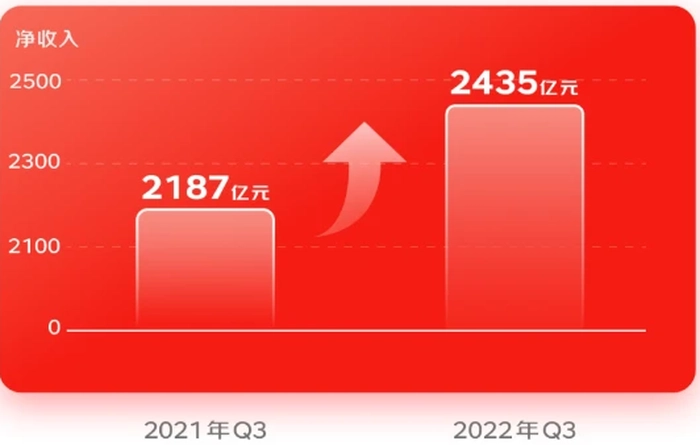 据财报显示,京东集团2022年三季度总营收2435亿元,同比2021年同期的2187亿元,增长了11.3%,增速约为同期国内社会消费品零售总额3.5%的3倍。其中,净服务收入增长喜人达到465亿元,同比增长42.2%,占总营收的19.1%,为历史新高。