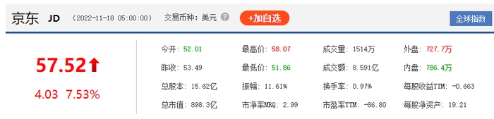 资本或早已经嗅到京东三季报的味道,在11月18日,近期持续震荡的京东股价上涨7.53%,每股股价为57.52美元,最新总市值为889.3亿美元。