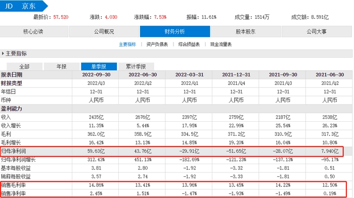 事实也是如此,京东在2022年第三季度归母净利润为60亿元,而去年同期的净亏损则高达28亿元,也就说,一年的时间,京东逆转了净利润88亿元。