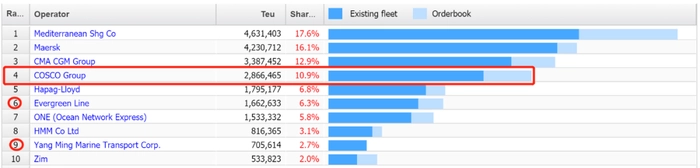 BT财经曾对中远海控进行过详细解读,中远海控(COSCO)是目前世界运力排名最高的中国航运企业,以2,866,465TEU、10.19%的市场占比位列全球第四。中国台湾的长荣海运和阳明海运则分别位列第六和第九名。