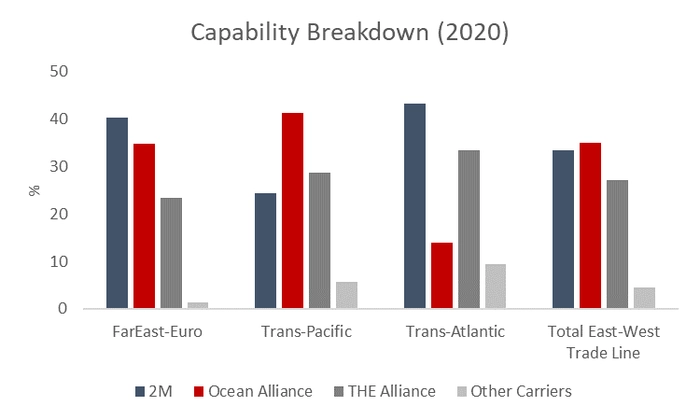 在回答这个问题之前,首先需要了解的事实是,三大航运联盟虽然市场地位超群,但贸易范围主要为覆盖亚洲、欧洲和北美的东西方向航线。据了解,三大航运联盟在亚欧航线、跨太平洋航线、跨大西洋航线三条全球集装箱主干航线上合计运力占到市场份额的近九成,亚欧航线上的运力占比更是达到100%。