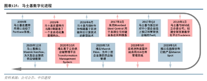 2016年,马士基就与IBM在区块链和云计算技术上进行合作;2018年,双方合资建立了基于区块链的全球贸易数字化平台TradeLens,货主、海洋和内陆承运方、货代和物流服务商、港口和码头、海关等供应链合作伙伴可实时访问运输数据和运输文档。2020年,地中海航运和达飞轮船都加入了TradeLens。