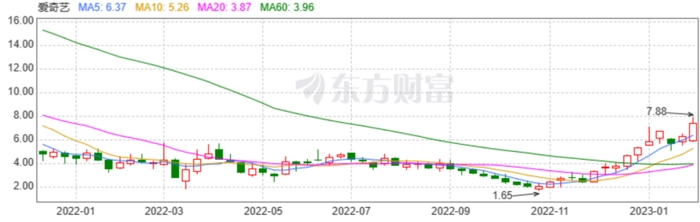 《狂飙》不仅刷新了爱奇艺的历史热度记录,开播后股价还涨了超过10%。短短3个月,由2022年10月底的1.65美元/股一路上涨至2月14日的7.52美元/股,累计涨幅达350%。