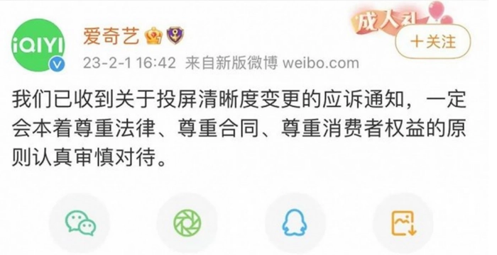 爱奇艺在回应中声称,已收到关于投屏清晰度变更的应诉通知,一定会本着尊重法律、尊重合同、尊重消费者权益的原则认真审慎对待。但并未就随意变更服务内容进行道歉。
