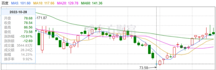 也正因为在研发领域的不断投入,百度的业务开始尝到甜头。2022年下半年,随着文心大模型的出现,越来越多用户体验到百度AI技术的实力,资本市场对百度的看好开始凸显。股价在2022年10月进入低谷后开始强势反弹,由2022年10月28日最低73.58美元一路涨至2023年2月19日收盘的149.01美元,涨幅高达103%。