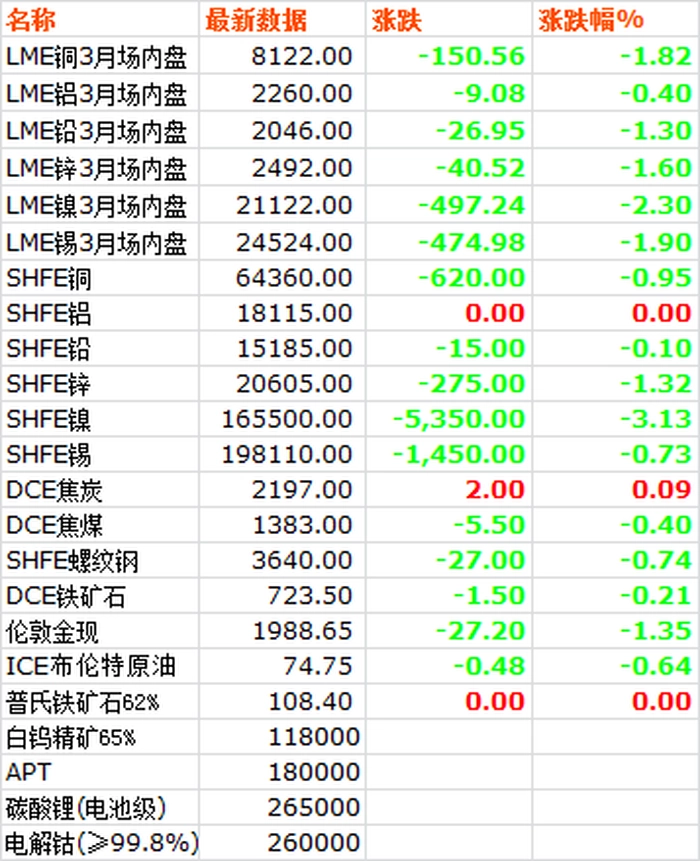 5月16日,LME六种基本金属价格全线下跌,高开低走低收,镍锡铜跌幅居前。三月期镍价领跌大盘,收于21122,下跌2.3%。三月期锡价收于24524,下跌1.9%。三月期铜价收于8122,下跌1.82%。三月期锌价收于2492,下跌1.6%。三月期铅价收于2046,下跌1.3%。三月期铝价收于2260,下跌0.4%。