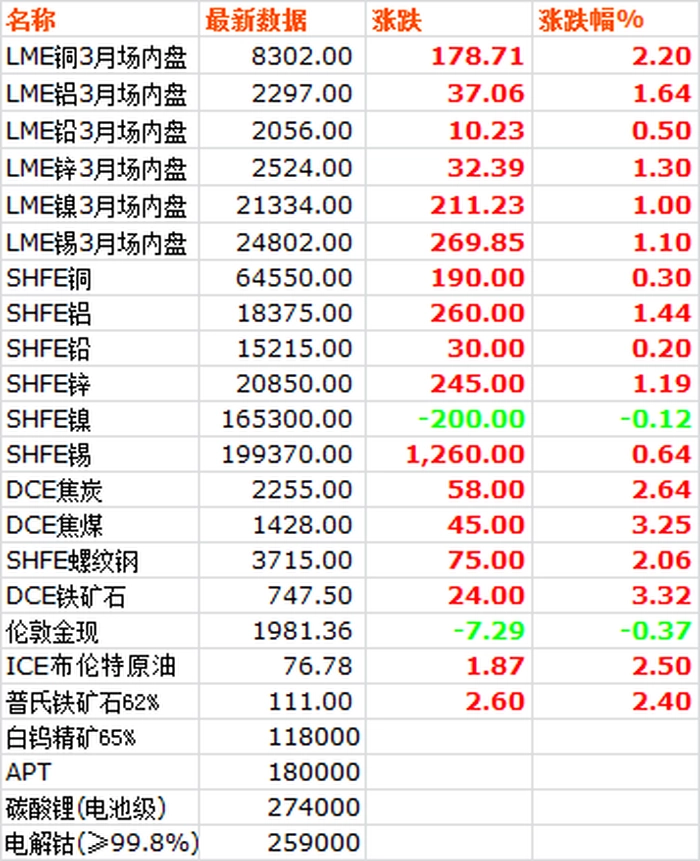 5月17日,LME六种基本金属价格全线上涨,低开高走高收,铜铝锌涨幅居前。三月期铜价领涨大盘,盘中最高8339,收于8302,上涨2.2%。三月期铝价收于2297,上涨1.64%。三月期锌价收于2524,上涨1.3%。三月期镍价收于21334,上涨1%。三月期锡价收于24802,上涨1.1%。三月期铅价收于2056,上涨0.5%。