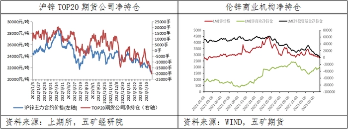 4月28日,沪锌持仓量TOP20期货公司由净持多头头寸1307手转为净持空头头寸20414手,显著扩大空头敞口;伦锌商业机构净持空头头寸26345手,较上月同期空头敞口收窄2630手,投资基金转为净持空头头寸345手,较上月同期多头敞口缩窄8801手。