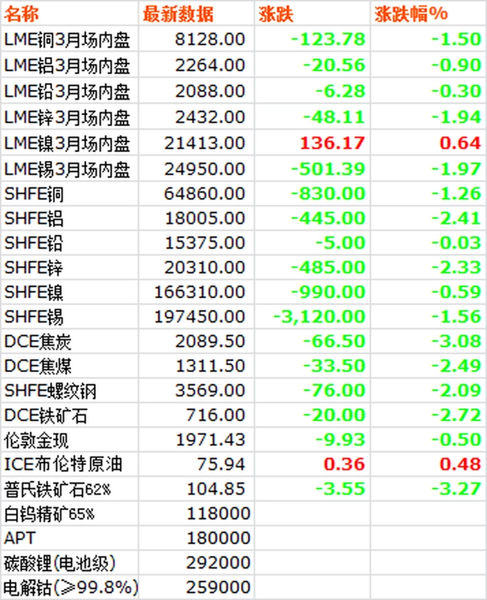 5月22日,LME六种基本金属价格除镍外普遍下跌,高开低走低收,锡锌铜跌涨幅靠前。三月期锡价领跌大盘,收于24950,下跌1.97%。三月期锌价收于2432,下跌1.94%。三月期铜价收于8128,下跌1.5%。三月期铝价收于2264,下跌0.9%。三月期铅价收于2088,下跌0.3%。三月期镍价逆势上涨,收于21413,上涨0.64%。
