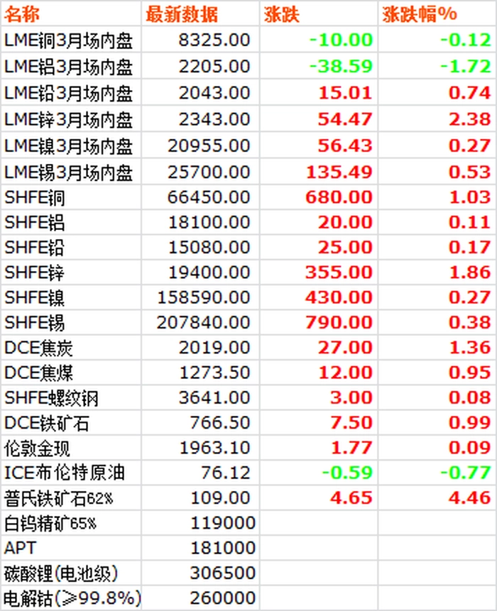 6月6日,LME基本金属涨多跌少,锌领涨。3月期锌收于2343美元/吨,上涨2.38%;3月期铅收于2043美元/吨,上涨0.74%;3月期锡收于25700美元/吨,上涨0.53%;3月期镍收于20955美元/吨,上涨0.27%;3月期铝高走低收,收于2205.5美元/吨,下跌1.72%;3月期铜以震荡为主,收于8325美元/吨,下跌0.12%。