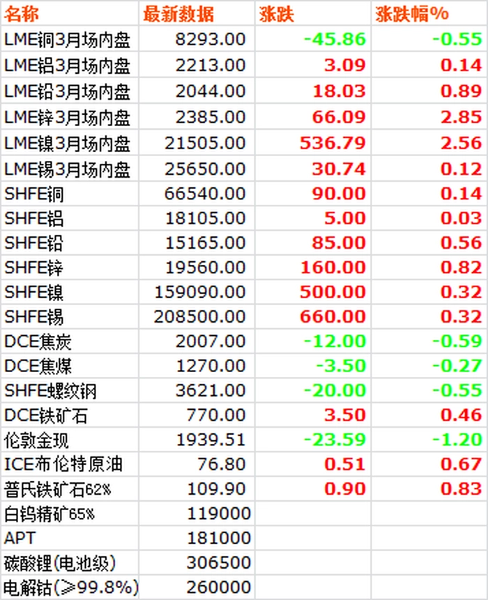 6月7日,LME基本金属涨多跌少,仅铜微幅下跌,锌镍领涨。3月期锌高走高收,收于2385美元/吨,上涨2.85%;3月期镍收于21505美元/吨,上涨2.56%;3月期铅收于2044美元/吨,上涨0.89%;3月期铝以震荡为主,收于2213美元/吨,上涨0.14%;3月期锡收于25650美元/吨,上涨0.12%;3月期铜冲高回落,收于8293美元/吨,下跌0.55%。