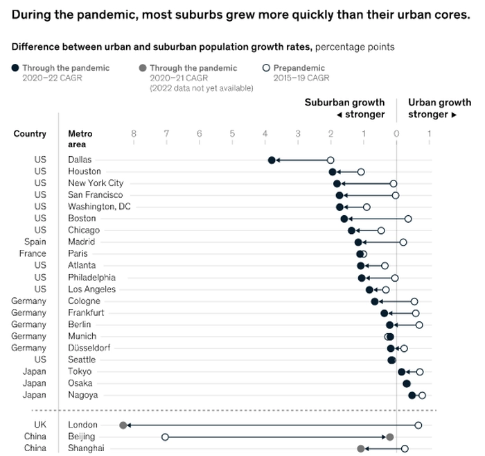 与此同时,郊区也能从中受益。城市居民摆脱了日常通勤的束缚,因此是否住在远离城市核心的地方也变得无所谓。郊区更多的住房和更好的零售可以帮助满足人们的生活需求。
