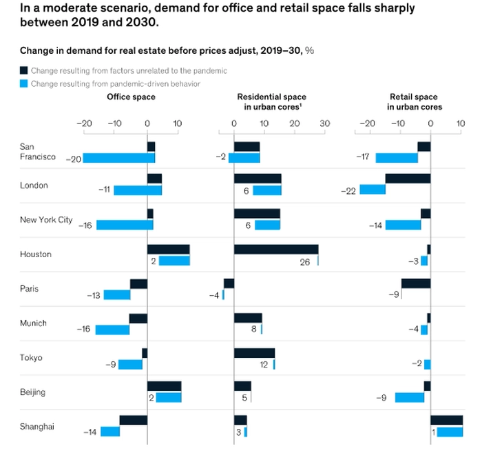 超级城市的房地产会在多大程度上继续受到影响?麦肯锡全球研究所()模拟了在这种情况下,未来对办公、住宅和零售空间的需求。结果显示,2030年,人们对办公和零售空间的需求或将低于2019年。