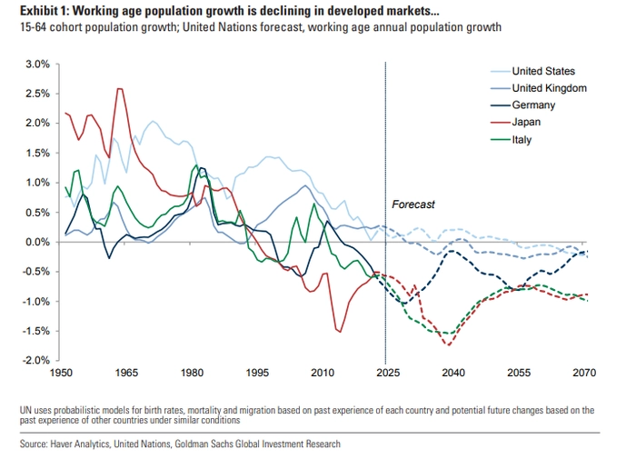 正如Kathy Matsui20世纪90年代在《日本女性经济学Japan Womenomics》中所写得那样,日本的人口老龄化问题曾经是全球独一无二的。但近年来,意大利、德国和欧洲其他大部分国家也加入了这一行列。这不仅是发达市场的问题,部分新兴世界的劳动年龄人口下降幅度也增大。