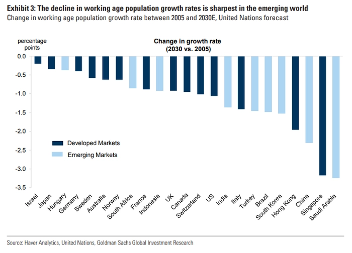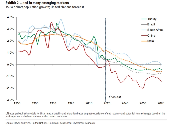 15年前,我们的研究集中在“人口转型”的积极方面。当时是生育率下降造成的影响:儿童数量减少,但适龄工作人口的大量增长对许多新兴市场来说是一个福音。然而,这个窗口期现在也基本上关闭了。此外,劳动年龄人口的减少将因其他问题而加剧,其中包括地缘政治风险和许多发达市场存在养老金融资问题。
