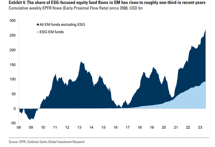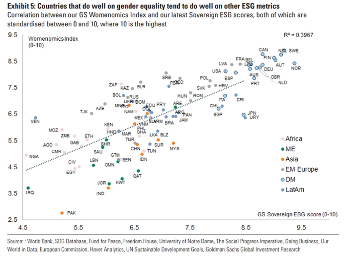 15年前,ESG基金的规模微不足道,如今在许多市场中,ESG基金代表着边际投资。例如,根据过去六年的数据,三分之一的新兴市场股票基金以ESG为重点。此外,在性别平等方面做得好的国家往往在其他ESG指标上也做得很好。