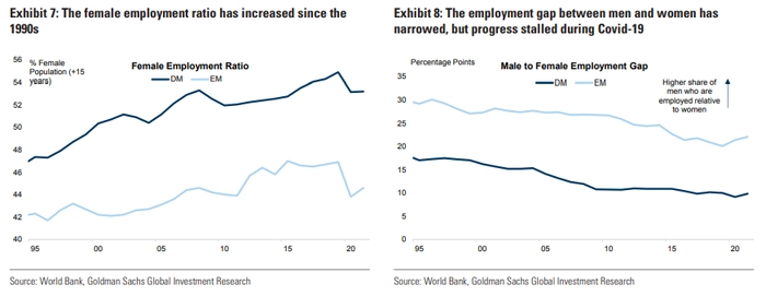 高盛预计,男女更加平等可以提高发达国家和新兴市场的GDP水平。即使将性别不平等减半,也可以使GDP提高5%-6%。