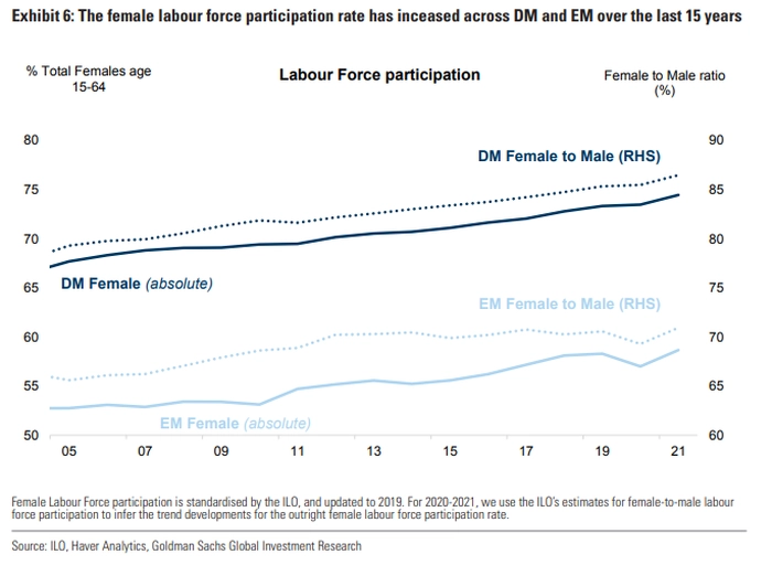 发达市场的女性劳动力参与率约为73%,新兴市场为58%,比2005年提高了约6个百分点。但是,也有一些例外:印度的参与率只有20%。