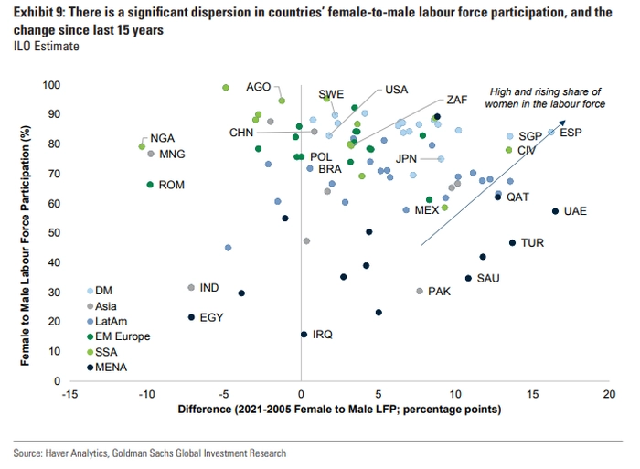 值得注意的是,在妇女参与劳动力方面,发达国家和新兴市场存在很大差异。上图显示了92个经济体的最新男女劳动力参与率,以及自2005年以来这一比例的变化情况。男女劳动力参与率改善最大的国家包括发达市场中的新加坡和西班牙,以及新兴市场中的科特迪瓦。在许多中东经济体,如阿联酋、卡塔尔和沙特阿拉伯,女性的劳动力参与率也有了显著改善。相反,一些国家女性劳动力参与率较低,如印度和埃及。
