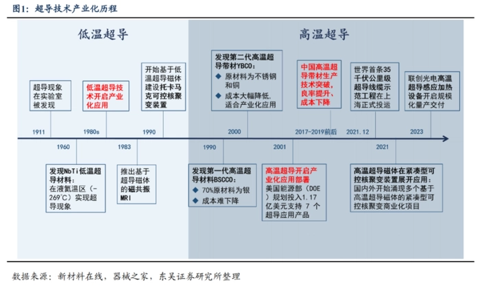 1987年,赵忠贤院士团队发现了-183℃以上铜氧化物高温超导现象,打破了科学界认知的传统超导转变温度上限,并在国际上公布了这一材料钇钡铜氧的元素组成;2008年,赵忠贤团队将铁基超导体的临界温度提高到-218.15℃,推动中国科学在高温超导领域的基础研究继续走在世界前沿;2013年,上海电缆研究所牵头建成的国内首套30米、35kV、低温绝缘高温超导电缆挂网运行;2016年,中科院电工研究所马衍伟团队研制出首根铁基超导线材、成功制造出全球第一根百米级铁基超导的线材,推动超导在实用化方向迈出实质性一步;2021年12月,全世界首条35千伏公里级超导电缆示范工程在上海投运……