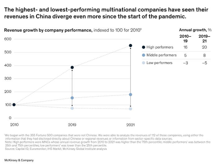 跨国公司现在正在认真地审视自身,他们是否能采取在中国取得成功的正确战略。事实上,随着表现最好和最差的公司之间差距的不断扩大,许多跨国公司正在失去优势,正如下图所展示的那样。对于2010年至2021年增长最快的跨国公司来说,在这一时间段的最后两年,这些公司每年收入20%,而前九年的年增长率仅为16%。与此同时,那些业绩不佳的跨国公司所拥有的机会正在减少:2010年至2021年期间,收入萎缩最快的跨国公司在疫情开始后的收入损失达到每年5%,比之前的每年3%更快。