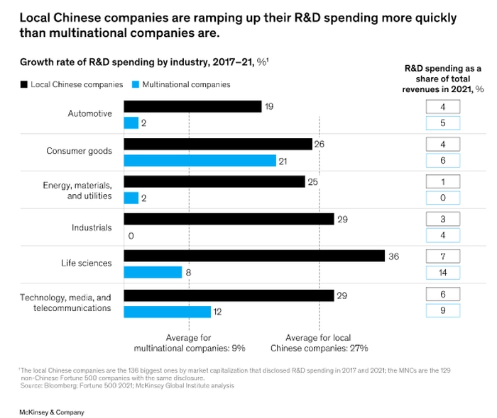 此外,在许多行业,中国的本土企业与跨国公司的市场份额竞争变得更加激烈。例如,从2006年至2020年,跨国公司在中国的总收入份额从16%下降到10%。在过去的10年里,销售便携式电子产品、杂货、5G基础设施的本土企业的市场份额增加了20 - 40%。在2017年至2021年间,中国最大上市公司的研发支出增长速度是其他国家财富500强公司的三倍,如下图所示。
