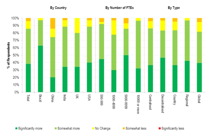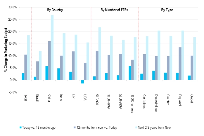 从进一步细分的市场来看,未来12个月美国广告活动的增长率为7.0%(低于上次调查的9.5%)、英国为+11.8%(相对较为稳定)、印度为+10.1%(高于1月份调查的6.1%)、中国为+16.1%(高于1月份调查的10.6%)以及巴西+7.7%(低于1月份调查的15.4%)。