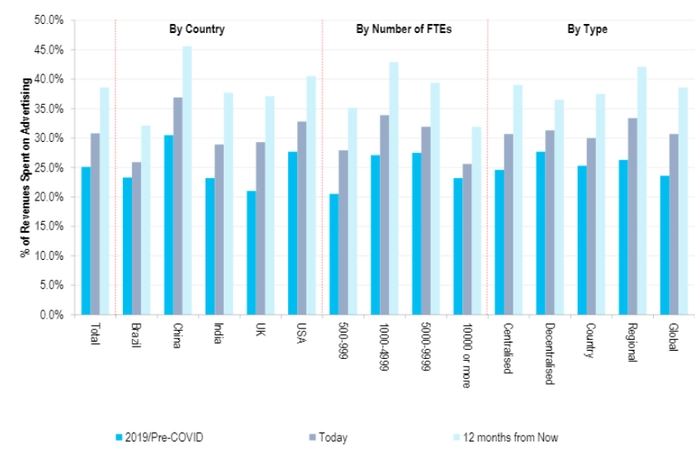 与此同时,CMO的调查进一步表明,社交媒体平台的整体广告预算分配将会增加。从对受访者的调查来看,疫情前这一比例为24.4%,而如今的广告分配将达到31.5%,一年后或将上升到37.8%。