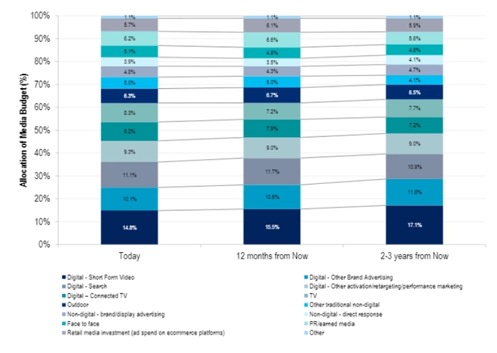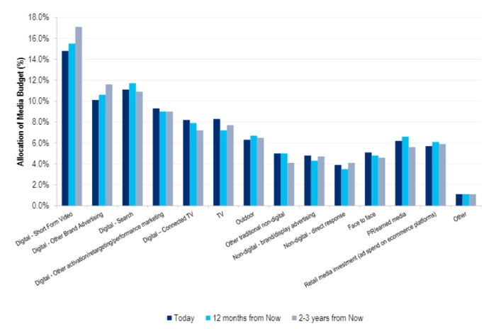 第二个重要的发现是,短视频不仅仍然是最大的单一广告投放形式,而且是在12个月和36个月的时间里继续占据广告市场份额的两个类别之一,这两个类别中的另一个是“数字/其他品牌广告”。花旗团队表示,令人惊讶的是,其他形式的数字营销,尤其是搜索和效果营销(Search and Performance Marketing),在未来2-3年内所占的比例份额将逐渐减少。