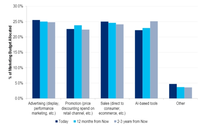 CMO的调查显示,在某种程度上,22%的营销预算受到了基于人工智能的工具的影响,尽管这一比例将随着时间的推移而增长(从现在的22.2%到12个月后的22.9%,并在2-3年内达到25.1%),但从数量上来看,对预期的支出和预算分配来说,这并不是一个巨大的变化。
