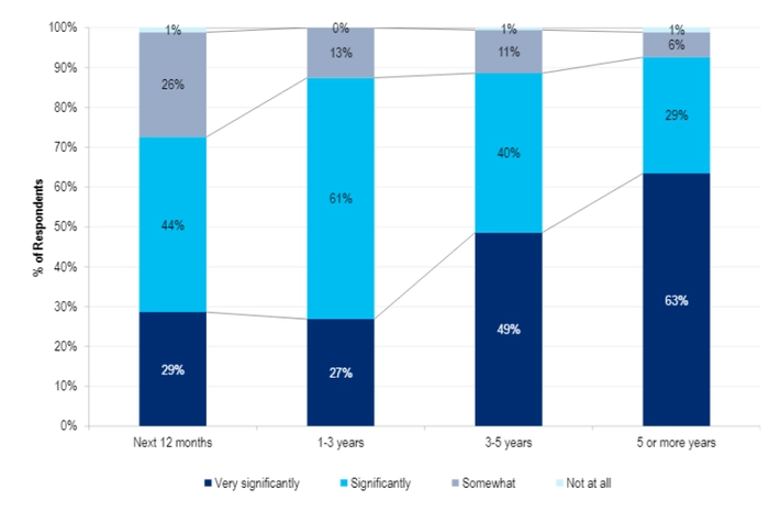 然而,从本质上讲,这意味着生成式人工智能将对广告营销行业产生更深远的影响。CMO认为,生成式人工智能将会对广告行业产生一定程度的影响。63%的受访者认为,预计五年后生成式人工智能会对广告行业产生“非常显著”的影响,这是相当确定的。