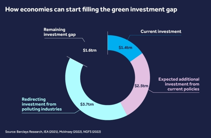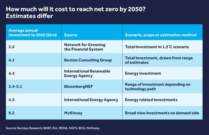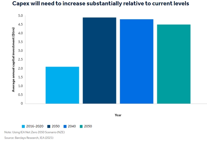 到2050年,想要实现净零排放目标的绿色转型,则需要对世界能源、运输和工业系统进行全面改革,并转变农业和林业行为。这将需要大量的投资——远远超过目前世界所能提供的。巴克莱分析师列出了该领域投资需求的三个关键方面。