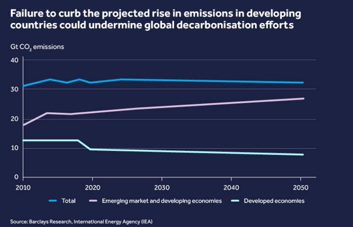 由于能源占全球排放量的近75%,而发展中经济体在未来几乎占了所有额外的能源需求,因此需要大量投资,以避免发达经济体的脱碳努力无法抵消全球排放量增加的情况。