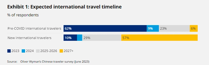 尽管大约60%有经验的中国国际旅行者(在新冠疫情之前进行过国际旅行的人)已经旅行过或计划在2023年进行旅行,但仍有约30%的游客计划等待两年多才再次进行国际旅行。虽然奥纬咨询也认为在受到疫情影响国际旅行暂停三年后,每个人都会希望尽快再次出国旅行,但对一些游客来说,情况恰恰相反。