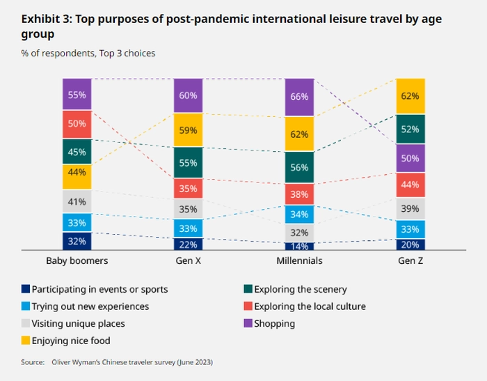 在新冠疫情之前,奥纬咨询的调查显示,购物作为游客国际旅行原因的重要性呈现出同比下降趋势,取而代之的是探索风景成为旅行的主要动机。然而现在,购物已经重新成为游客国际旅行的首要原因,其次是享受美食。这一趋势在Z世代旅行者中尤为明显,62%的受访游客表示,享受美食体验是他们进行国际旅行的首要原因。