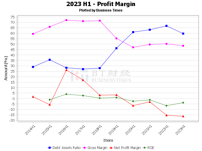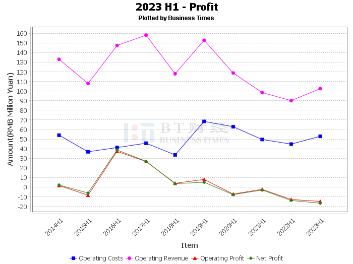 Operating income for this reporting period was 102 million yuan, compared to 90 million yuan for the same period last year. Operating profit for this reporting period was -14.9 million yuan, compared to -12.8 million yuan for the same period last year. Operating costs for this reporting period were 52.8 million yuan, compared to 44.8 million yuan for the same period last year. Net profit for this reporting period was -16.7 million yuan, compared to -13.9 million yuan for the same period last year.