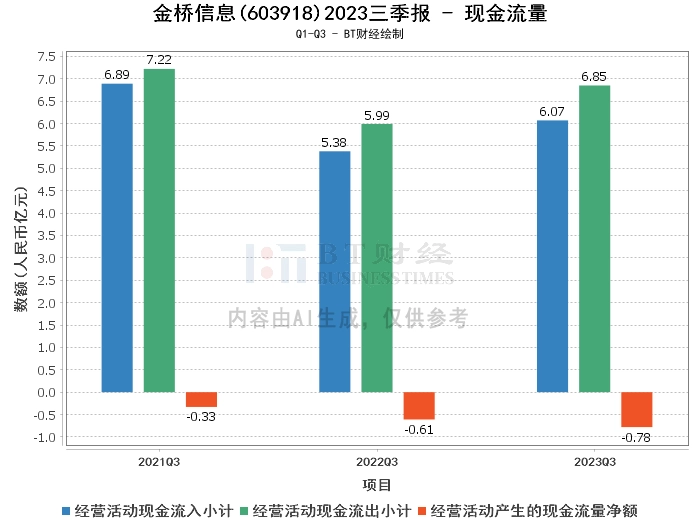 从资产负债方面来看,金桥信息2023年三季度的总资产为16.31亿元,相比上年度末的16.68亿元有所减少。负债总额为5.22亿元,较上年度末的5.88亿元也有所下降。净资产为11.09亿元,相比上年度末的10.8亿元有所增长。资产负债率为32.02%,较上年度末的35.24%有所下降。