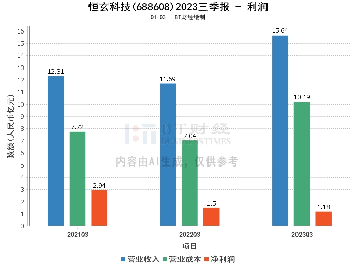 在利润方面,恒玄科技2023年前三季度的营业收入为15.64亿元,同比增长33.75%。营业利润为1.2亿元,相比上年同期的1.5亿元有所减少。营业成本为10.19亿元,相比上年同期的7.04亿元有所增长。净利润为1.18亿元,相比上年同期的1.5亿元有所减少。毛利率为34.84%,相比上年同期的39.77%有所下降。净利率为7.53%,相比上年同期的12.84%有所下降。这表明公司的营业收入在稳步增长,但由于成本上升,导致毛利率和净利率有所下降。