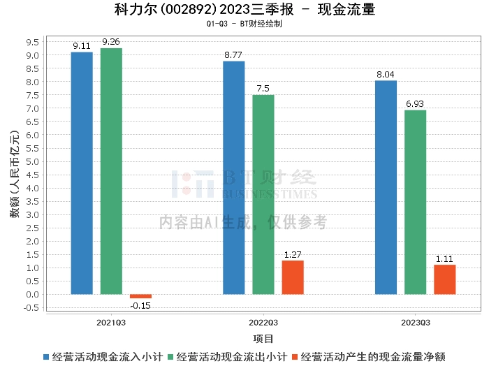 在现金流量方面,科力尔2023年三季度经营活动产生的现金流量净额为1.11亿元,较上年同期的1.27亿元有所下降。经营活动现金流入小计为8.04亿元,较上年同期的8.77亿元有所下降。经营活动现金流出小计为6.93亿元,较上年同期的7.5亿元有所下降。这些数据显示,公司的经营活动产生的现金流量净额和现金流入均有所下降,但现金流出也有所下降,显示出公司的现金流动情况整体稳定。